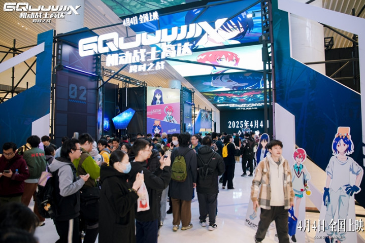 这天,上海影城大厅被布置成高达主题沉浸式展览。影片中出现的全新机甲GQuuuuuuX(吉夸克斯)立像吸引众多粉丝打卡合影。《跨时之战》在原作世界观基础上创造了全新人物和故事线,将恢弘的太空战争动作场面与赛博朋克风的青春生活融为一体,在满足粉丝情怀的同时,试图吸引更多年轻影迷的目光。